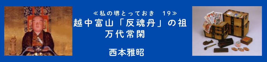 江戸時代中期、十一代万代常閑は家伝薬「延寿反魂丹」を携えて越中富山藩と関わりました。この薬が藩主前田正甫に用いられ、その効能が評価されたことが、後に全国へ広がる富山売薬文化の思想的な源流の一つになったとされています。堺に始まり、和気郡で育まれ、富山を通じて全国へ――万代常閑の歩みは、地域を越えて人々の暮らしを支えた日本文化の姿を今に伝えています。