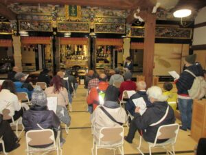この辺りの地形は石津川で形成された河岸段丘で坂が多く、登ると室町時代からの因念寺です。本堂は70畳と堺で2番目の広さ。平成の修理で内陣は全面金箔が貼り直しされ、本尊の阿弥陀如来は修理前に拭い取った埃を、張り直した金箔の上から再度塗りつけ黒いお姿に。今も本尊は数百年の苦楽を身に纏っておられるそうです。
