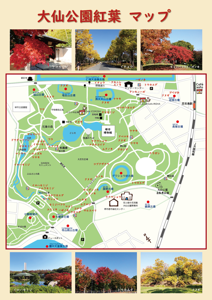 【コース】収塚古墳前(トウカエデ) → 仁徳陵(ハゼノキ) → イチョウ並木 → 日本庭園(イロハモミジ) → 七観音古墳(モミジバフウ) → 履中陵ビュースポット → 旗塚古墳(ムクロジ) → ビジターセンター前(ナンキンハゼ)→阪和線 百舌鳥駅